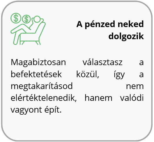 Oktatás (megtanítalak „horgászni”): Megismered majd, hogy milyen számodra is elérhető termékek és lehetőségek vannak a pénzed fialtatására. Lesz szó állami támogatásokról és adójóváírásról is. Megérted, mi a különbség a „jó hitel” és a „rossz hitel”, vagy a befektetés és a szerencsejáték között.